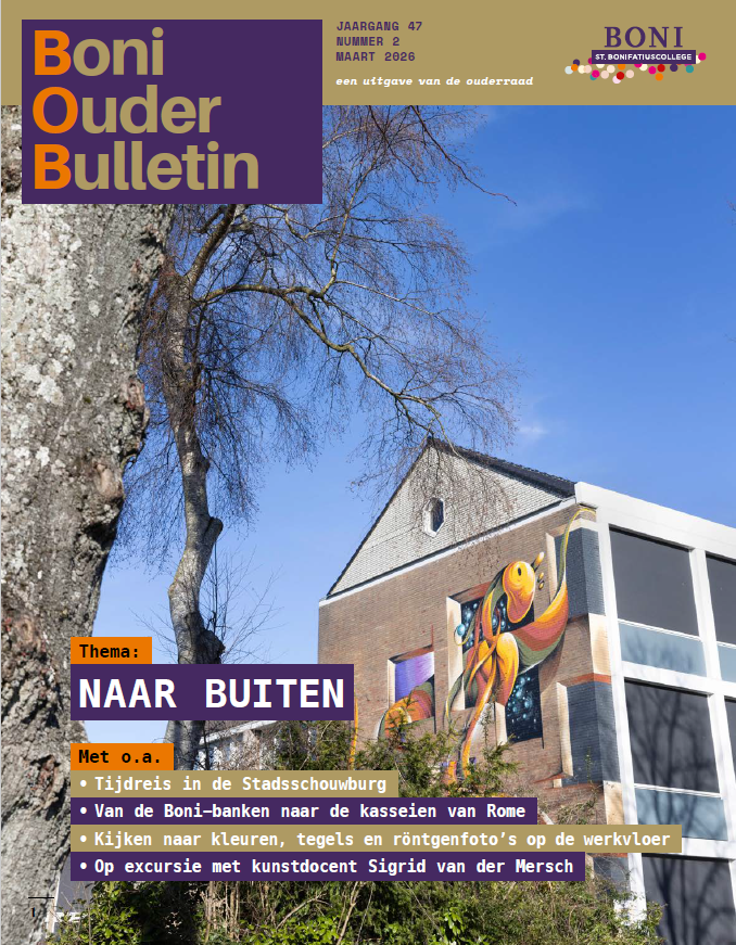Daarnaast kunt u meer lezen over de stages van de vierde klas, het hoekschopgebied op het buitensportveld, wat er gebeurt als leerlingen buiten het boekje gaan en hoe oud-leerling Jochem Uytdehaage zijn tijd op het Boni heeft ervaren.